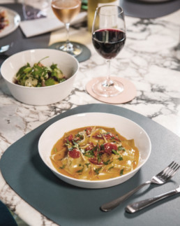 Lo chef stellato Armand Arnal, incaricato della supervisione del menu proposto dal ristorante, ha selezionato i piatti della collezione Gesso per la mise en place dei tavoli.